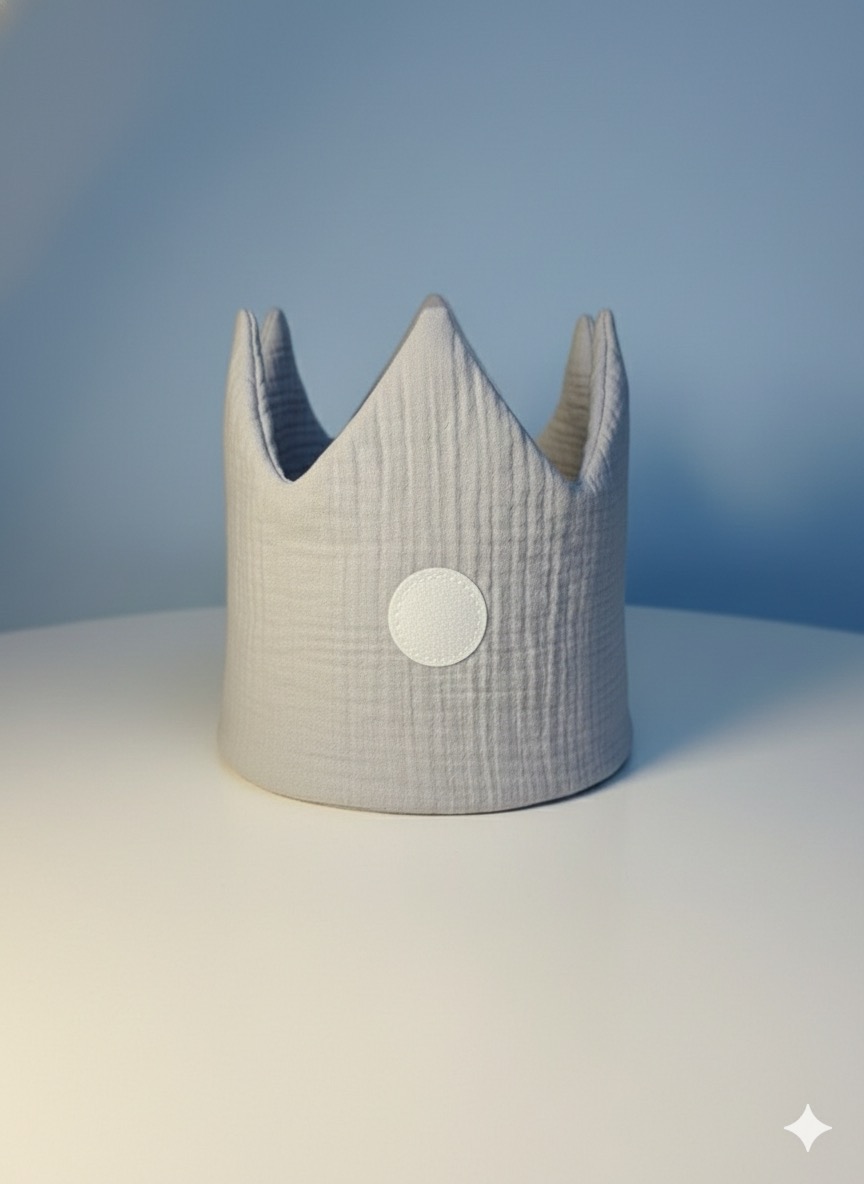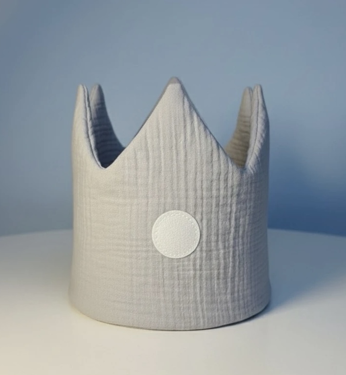 Diese liebevoll handgefertigte Geburtstagskrone von mitliebefranzgemacht aus weichem Musselin in Hellgrau ist der perfekte Begleiter für unvergessliche Kindergeburtstage.