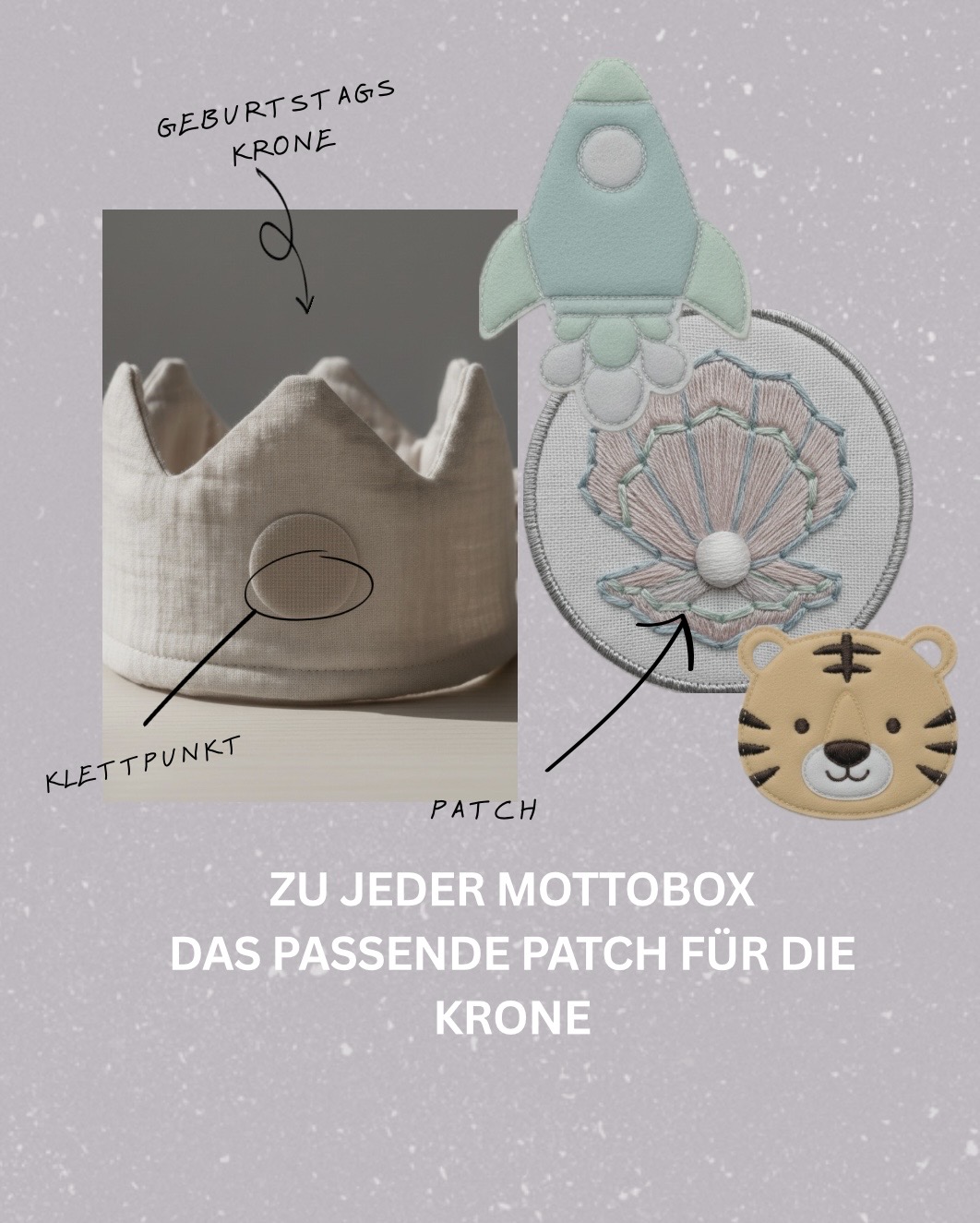 Dank der praktischen Schleife zum Binden lässt sich die Krone individuell in der Größe verstellen und wächst problemlos mit. Ein dezent integrierter Klettpunkt ermöglicht das einfache Befestigen von wechselbaren Patches.