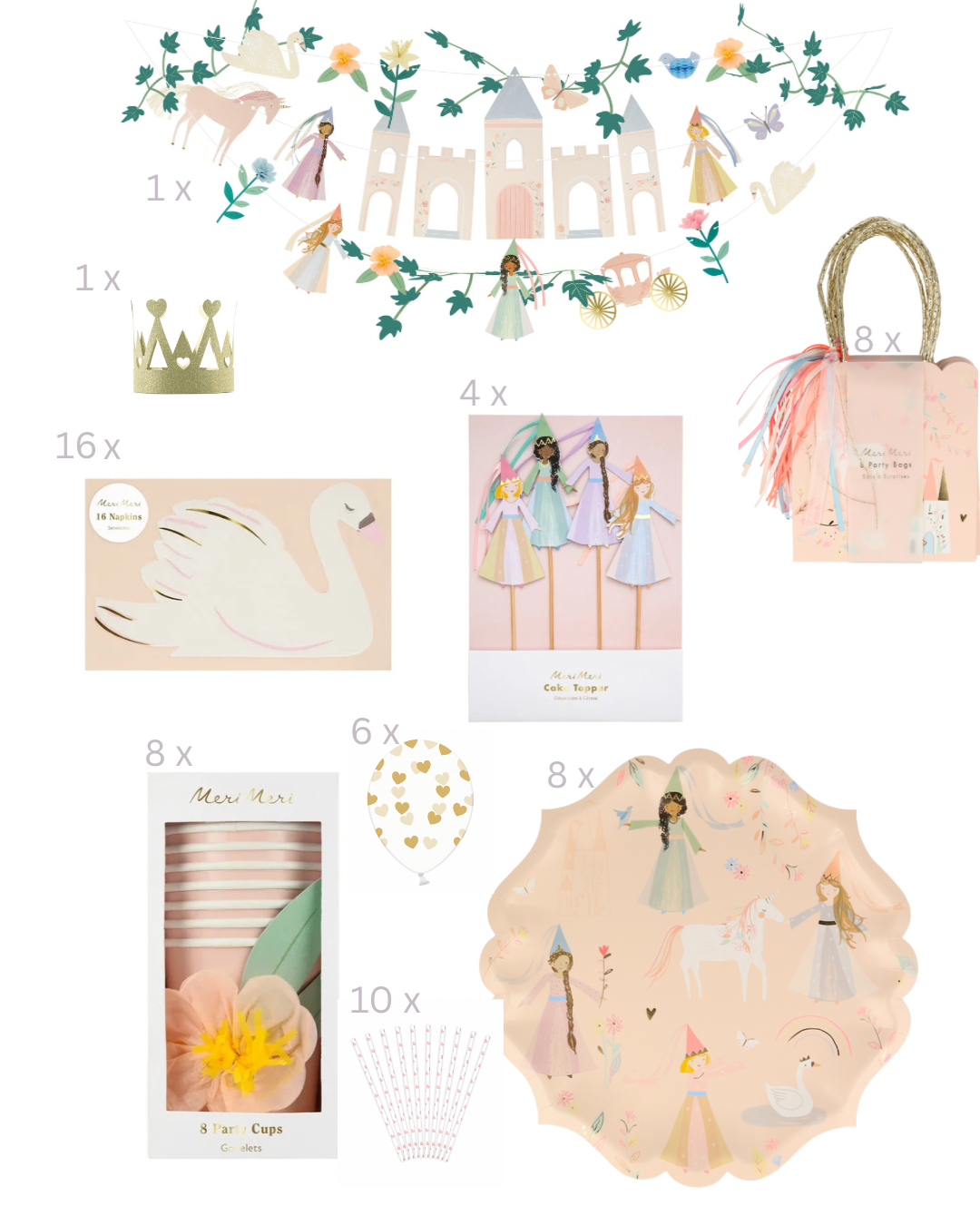 Die hochwertige Mottobox für den Prizessinnen Geburtstag für bis zu 7 Kindern + Geburtstagskind beinhaltet: